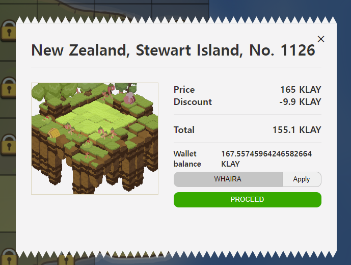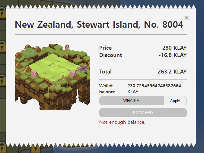 땅의 가격과 수량은 위와 같은데요, 여기서 6%를 할인 받는 방법이 있습니다. 땅을 구매할 때 이미지와 같이 할인코드를 넣는 곳이 있습니다. 이곳에 "WHAIRA"를 넣으면 6% 할인을 받을 수 있습니다.