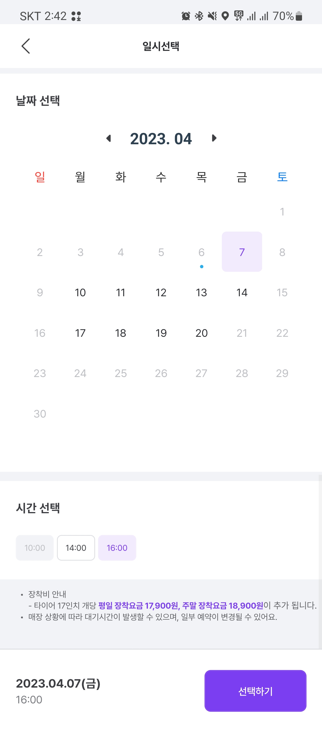 날짜를 정하고 결제를 하면 끝! 이 정도 가격이면 카센터에서 불렀던 가격 75만원보다 훨씬 저렴했다. 60만원에 휠 얼라인먼트에 장착까지 할 수 있었다.